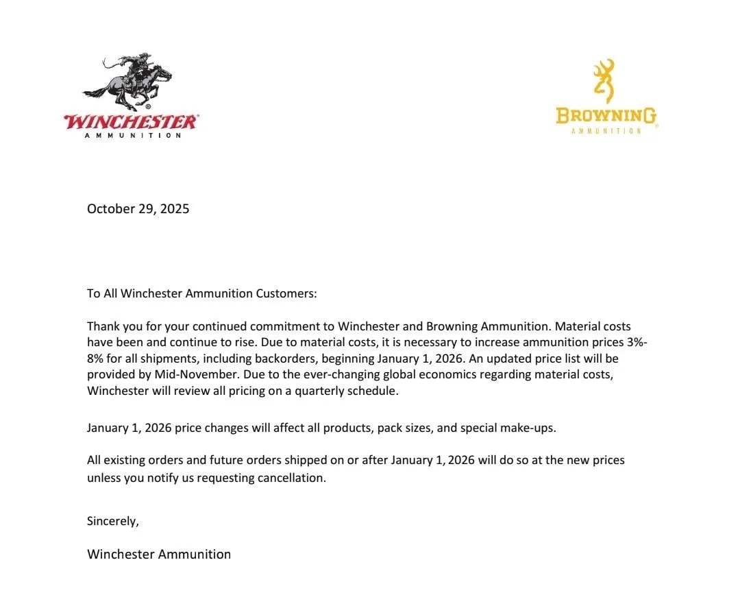 As with past notices, Winchester made clear that updated pricing will apply across all pack sizes, product lines, and “special make-ups.” A new price list is expected by mid-November.