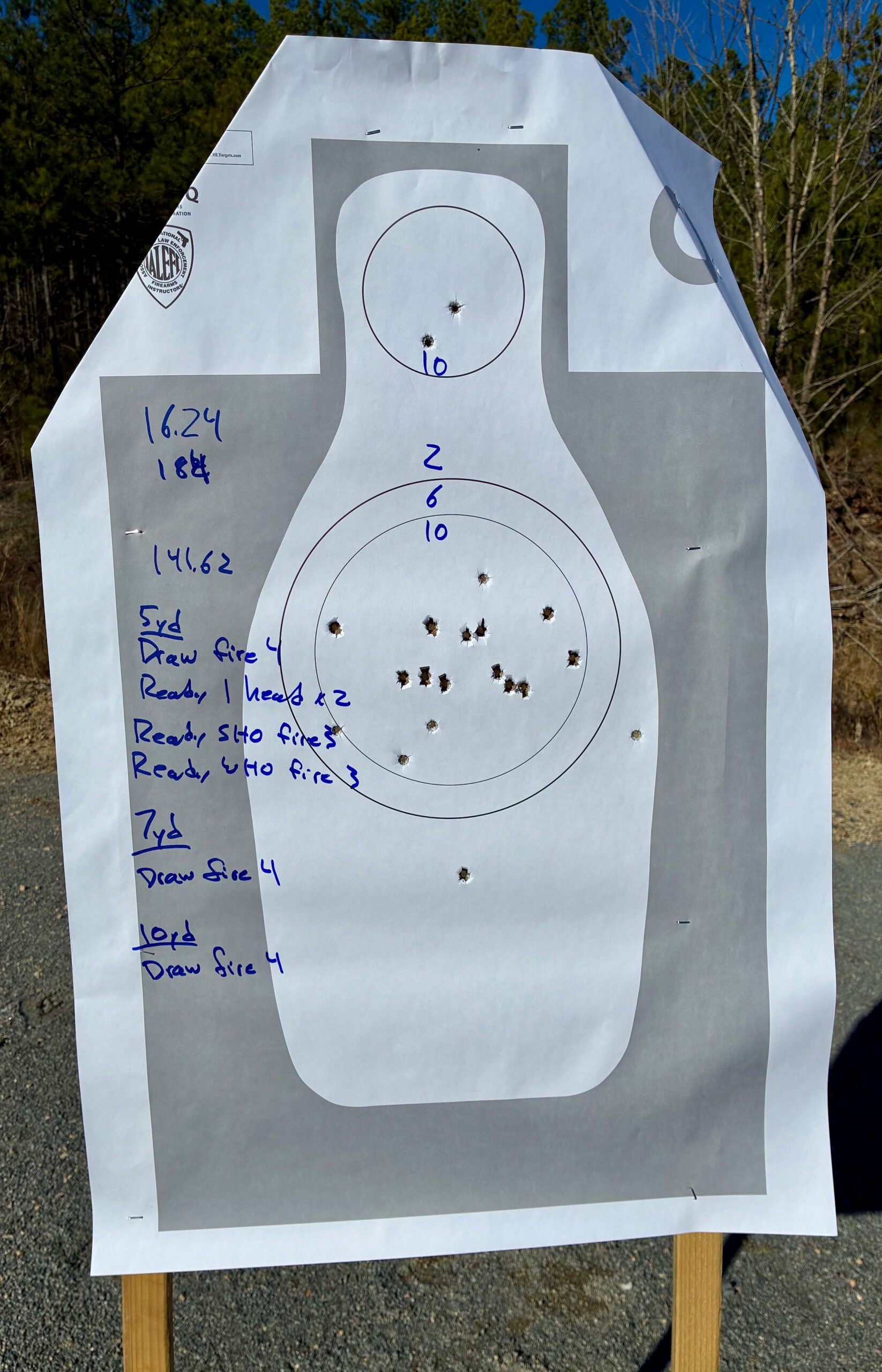 The target that should be used is RFTS-Q or IALEFI QP. Think FBI silhouette target with an 8” circle surrounded by a larger 10″ circle for the upper chest area, and 4” circle for the head. Hits inside the 8” circle or 4” head zone are worth 10 points, hits in the larger 10” chest area are worth 6 points. Hits inside the bottle shape above the “belt line” are worth 2 points. Alternatively, you could also shoot this on an IDPA target and get pretty close.