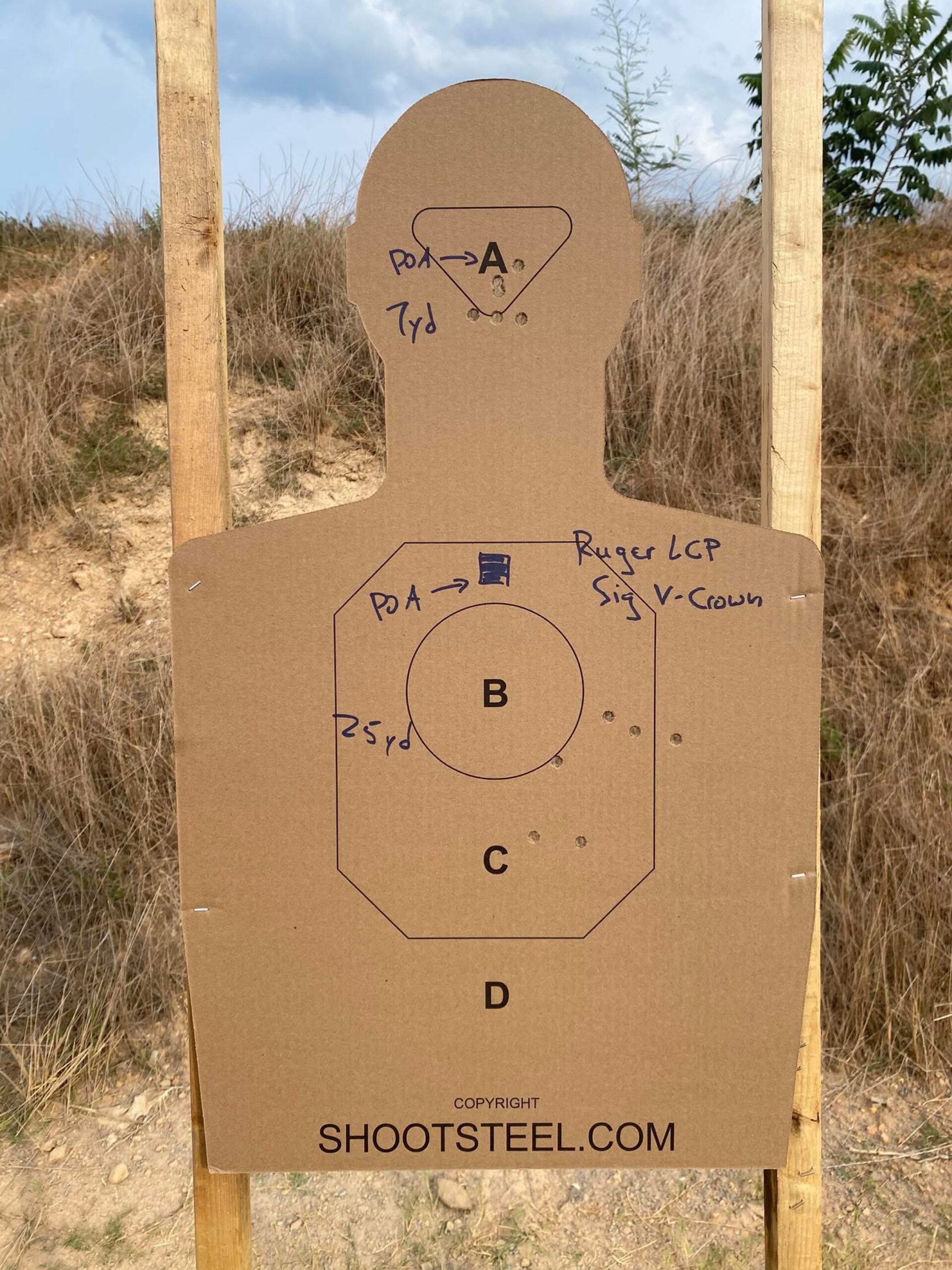 The gun does shoot a hair low with typical .380 loads. Sig V-Crown, Federal HST, Remington JHP, and WWB 95gr FMJ-FP all shoot low. Noticeable at 7 yards, but not enough to make a huge difference. Very noticeable at 25 yards, and enough to matter. Or I am too inept to use the sights that have yet to grow up into full blown adult sights. There is something about the shape of the sights that if I am not careful causes me to line them up with the front sight biased low in the rear notch. Could be a problem, but when shooting for groups, I tried my best to be careful about it and I am typically pretty good at this stuff. All groups were shot standing, unsupported (because that is how we shoot guns), and with two hands.