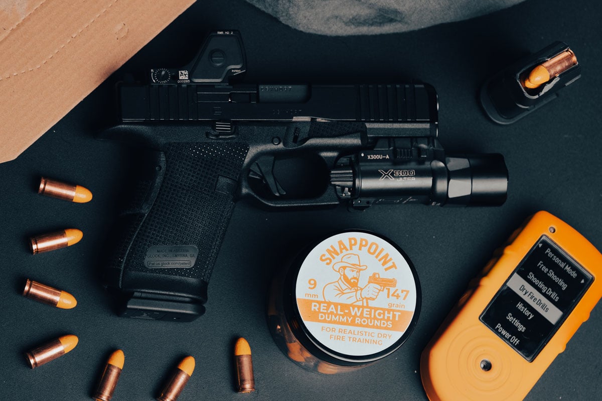 Most shooters simply use their empty standard magazines. As discussed, this leaves the gun significantly unbalanced. Some companies offer specific “dry fire magazines” that deactivate the slide stop so you can rack the slide without it locking back. While convenient for trigger reset drills, they do nothing to address the weight disparity.