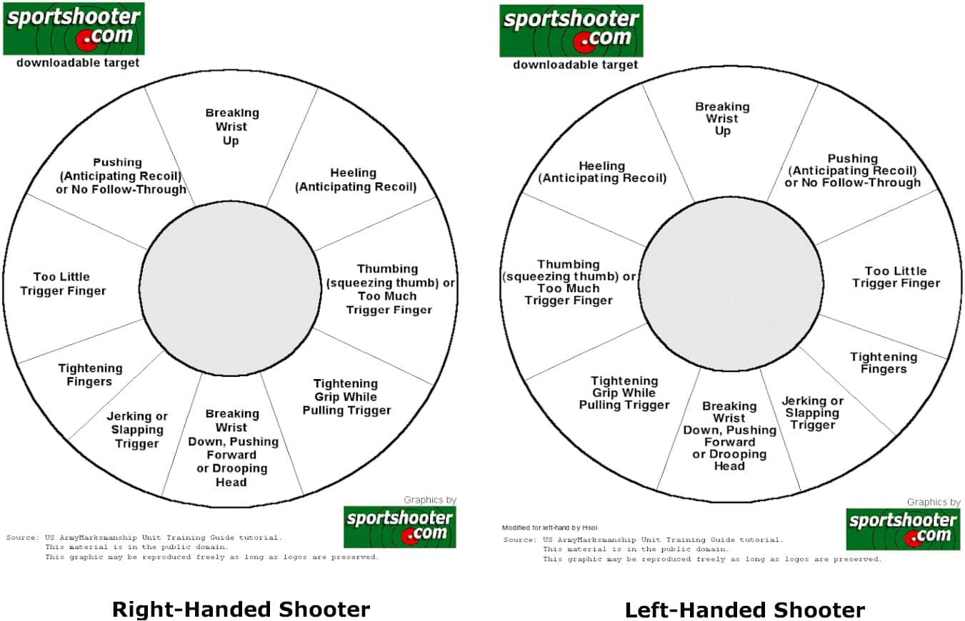 Jerking the trigger most often causes Hits at five o’clock or seven o’clock. Snatching the trigger too quickly pulls the muzzle down and to the side. To remedy this, take up the slack and then press the trigger straight to the rear smoothly.