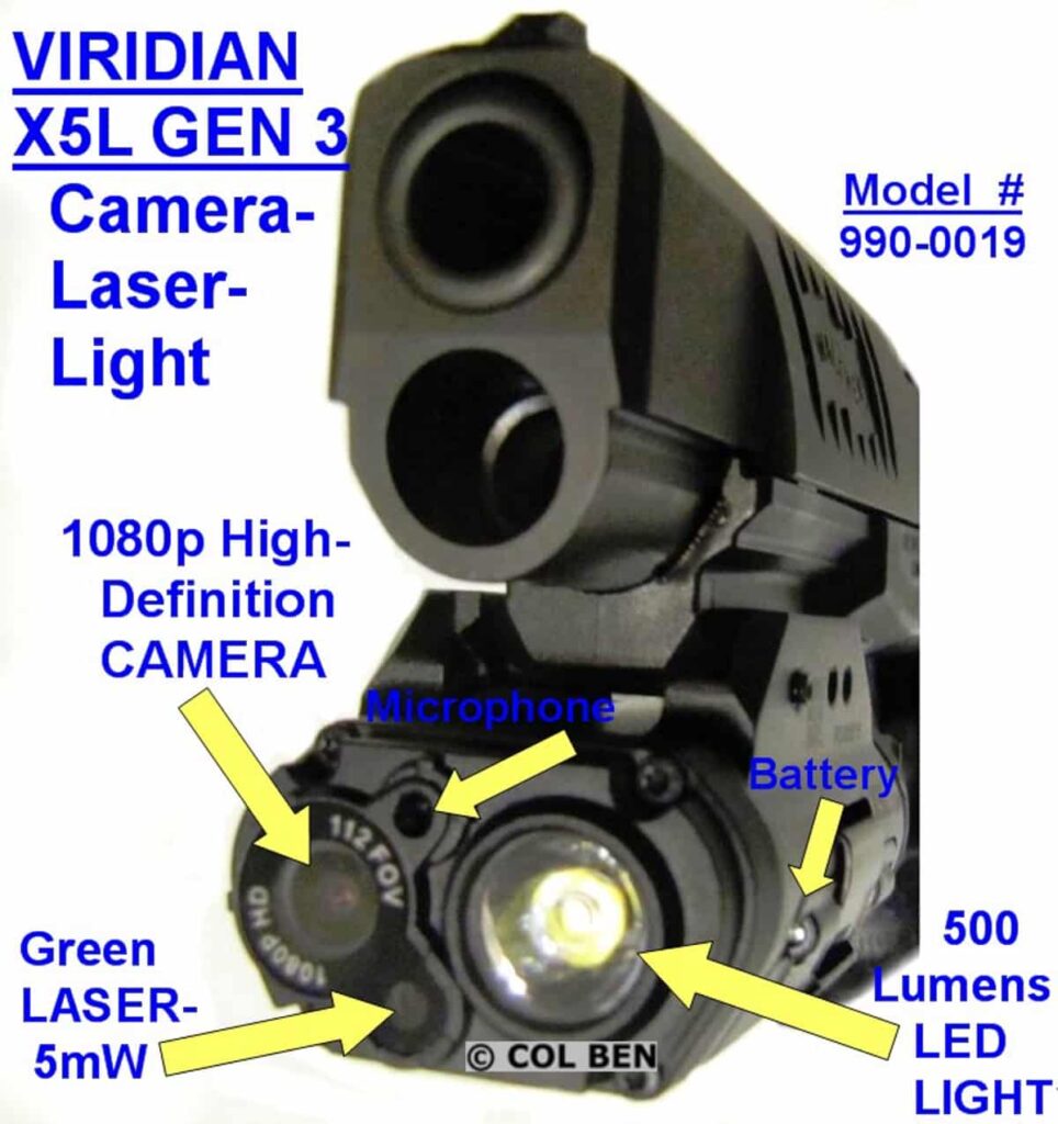 The full-featured Viridian X5L Gen 3 Model #990-0019 comes with an integrated Green laser, a 500-Lumens LED Tactical Light, and HD Camera with INSTANT-ON technology. Here are some of the Specifications and Features of the Viridian X5L Gen 3 camera system: